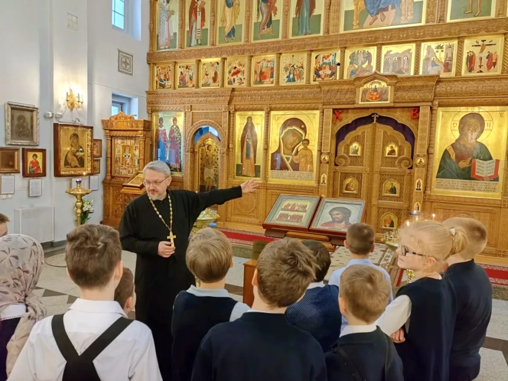Настоятель храма протоиерей Александр Зорин радушно встретил ребят, познакомил с устройством православного храма. Дети не только узнали о разных видах икон, но и увидели их в нашем храме: традиционные на досках, мозаичные на стенах внутри, витражные в оконных проемах алтаря и скульптурные на внешних стенах храма.